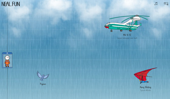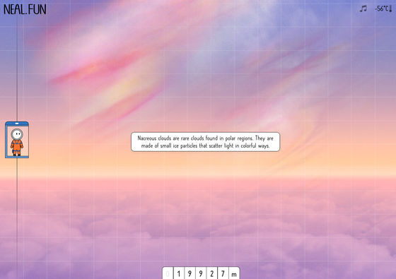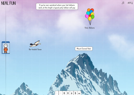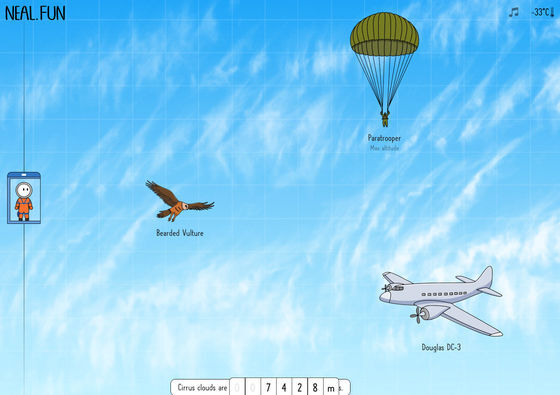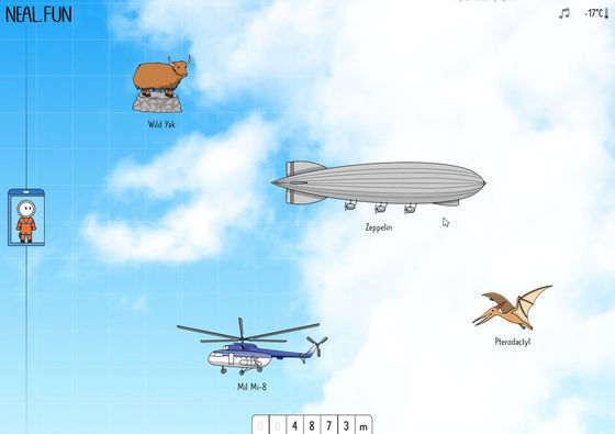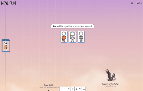 고도 1만 1000m를 넘은 근처에는 세계에서 가장 높이 나는 새라고 불리는 루펠 대머리 독수리가 날고 있습니다. 덧붙여, 여기서부터는 「우주복」을 입혀야 합니다. 클릭하면 엘리베이터 안에 있는 사람에게 맘에 드는 우주복을 입힐 수 있습니다.