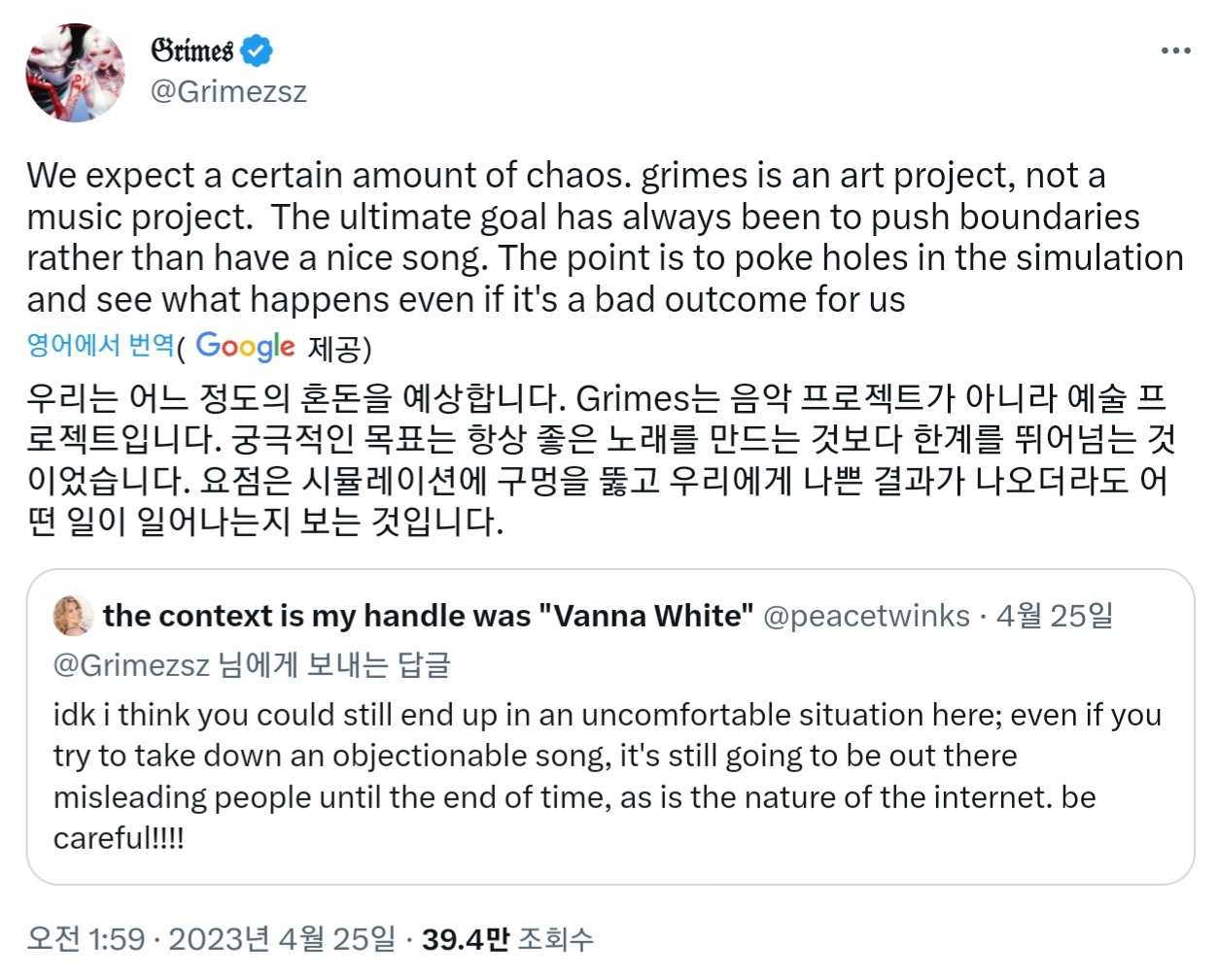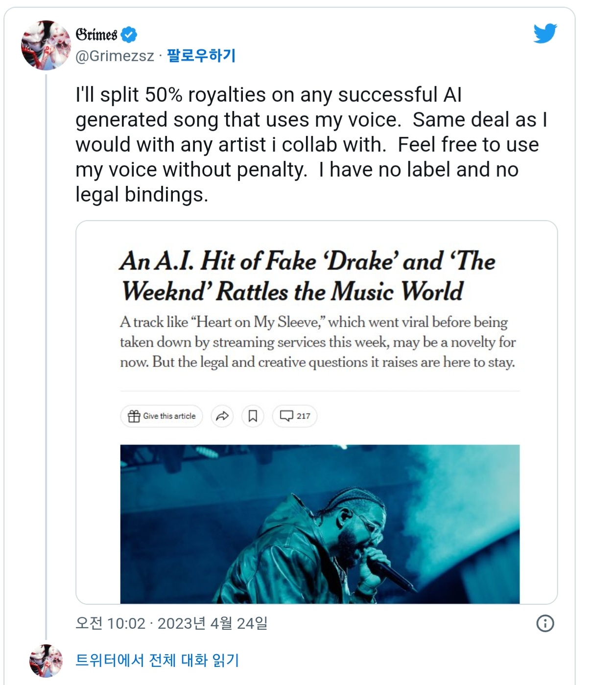 그라임스는 2023년 4월 24일 트윗에서 "내 목소리를 사용하여 AI가 생성한 곡이 성공할 경우 로열티를 50% 분배합니다. 페널티 없이 자유롭게 제 목소리를 사용하세요. 법적 구속력도 없습니다."라고 투고하였습니다.