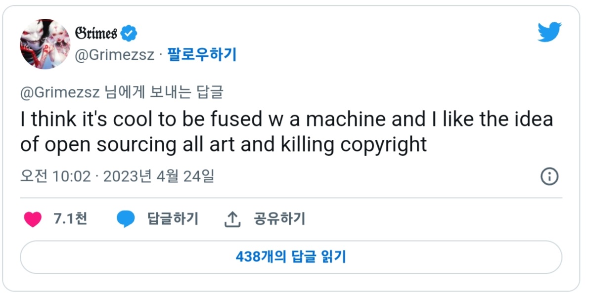 전 파트너인 일론 머스크가 AI를 위험시하고 개발 정지를 호소하는 서한에 서명한 것과는 대조적으로, 그라임스는 AI에 긍정적입니다. 그라임스가 투고한 트윗 중에서 "머신과 융합하는 것은 쿨하다고 생각하며, 모든 아트를 오픈 소스 화하여 저작권을 아주 없애버리는 것도 좋다고 생각합니다."라고 말하고 있습니다.