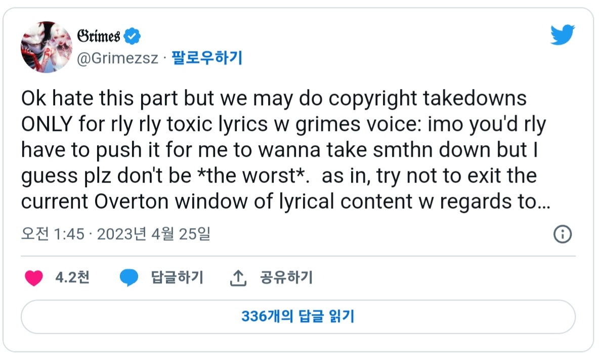 다만, 나치 찬양이나 아동 학대를 상기시키는 매우 유해한 가사를 포함하는 경우에는 저작권을 행사하여 삭제할 수도 있다고 그라임스는 덧붙였습니다.