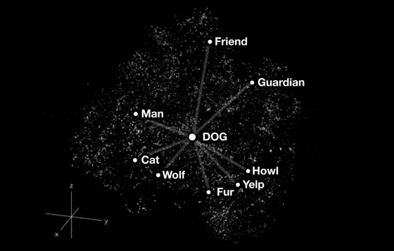 이 단어 간의 관계 패턴은 다른 언어 간에도 유사성이 있으며, spanish(스페인어)이든 english(영어)이든 japanese(일본어)이든, 「개」라는 단어는 맵상의 거의 같은 장소에 표시된다고 합니다. Raskin 씨는 "AI의 구조에 대해 1개만 유념해 둬야 한다면, 그것은 「의미적인 관계를 기하학적 관계로 바꾼다」라는 것입니다. 이것이 핵심 개념입니다."라고 말했습니다.