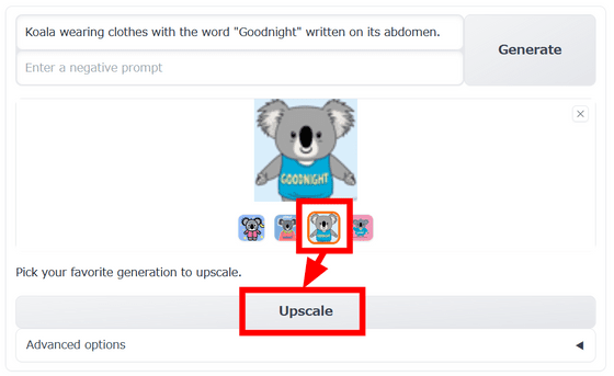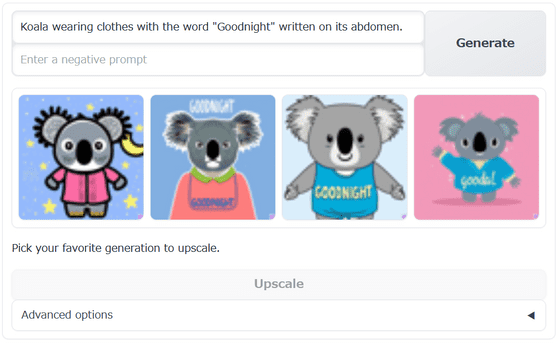 먼저 프롬프트를 입력하고 Generate를 클릭합니다. 이번 프롬프트로 "복부에 '잘 자'라는 문자가 적힌 옷을 입은 코알라"라고 한국어로 입력하고, Negative Prompt(적용하고 싶지 않은 프롬프트)는 공백으로 했습니다.