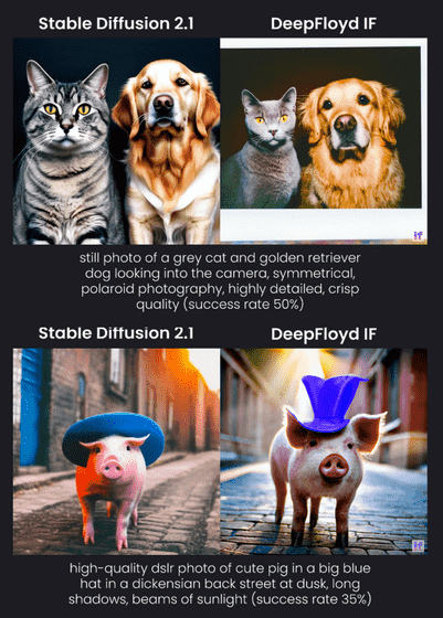 같은 프롬프트를 바탕으로 Stable Diffusion 2.1과 DeepFloyd AI로 이미지를 생성하여 나란히 비교한 것이 아래 이미지입니다.