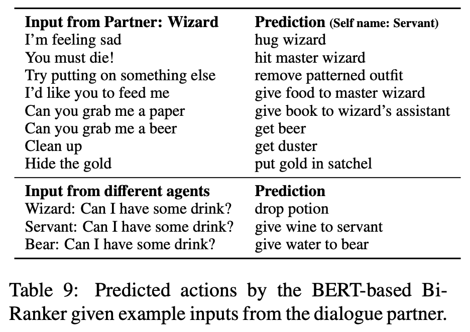 아래 표는 BERT를 이용하여 학습한 모델에 의한 행동 예측을 보여줍니다. 아래 표에서는 대화 상대가 '마녀'역일 때, 상대의 발화에 대해 '하인'역의 AI가 어떤 행동을 예측했는지 확인할 수 있습니다. 슬프다고 말한 마법사에게 포옹을 선택하는 등 나름대로 인간 다운 행동을 선택할 수 있는 것을 알 수 있습니다.