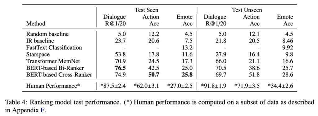 정답이 되는 자연어 문장을 모두 예측하는 것은 어렵기 때문에 어떤 평가도 다수 분류 문제로 평가합니다. 구체적으로는 행동과 감정에 대해 있을 수 있는 후보 하나를 선택하는 분류 문제로 평가하고 그 정답률(Acc)을 지표로 합니다. 또한 발화에 대해서는 정답이 되는 발화와 무작위로 선택한 19개의 부정적인 예 중에서 올바른 것을 선택할 수 있는가 하는 분류 문제로 평가하고 정답률을 지표로 합니다(R@1/20).