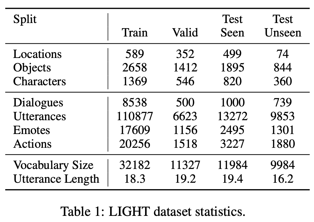 본 데이터 세트의 목적은 기계학습을 통해 플레이어의 발화 및 행동을 상황에 따라 적절하게 재현할 수 있는지를 평가하는 것입니다. 데이터셋은 훈련 · 검증 · 평가 용으로 분할하고, 그 내역은 아래 표와 같습니다. 평가용 데이터는 Test Seen 및 Test Unseen의 두 종류가 있으며, 전자는 훈련 데이터에 포함된 지리에서의 대화가 대상이 되고, 후자는 훈련 데이터에 포함되지 않는 대화를 대상으로 하고 있습니다. 즉, Test Unseen는 '처음 경험하는 환경'에서 모델의 거동을 평가할 수 있습니다.