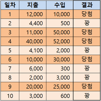어느 카지노를 좋아하는 A 씨는 "카지노에서 슬롯머신으로 돈만 따면 즉시 술값에 사용해 버리는" 습관 때문에 부인에게 주의를 받고 이달의 가계부를 쓰기로 했습니다. 10일분의 카지노 비용을 포함한 수익을 표로 정리한 결과, 다음과 같습니다.