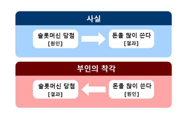 부인은 "슬롯머신에서 딴 돈을 바로 다시 사용한다"는 사실을 잊어버리고 인과관계와 상관관계를 뒤죽박죽 섞어서 판단한 것이 문제였습니다. 이 실수는 다음 그림으로 정리됩니다.