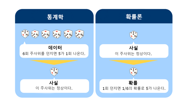 "사실로부터 어떤 일이 일어날 비율(확률)을 계산하는 것이 확률론이고, 숫자(데이터)로부터 사실 · 수치를 추측하는 것이 통계학이다." 이 정도로 대략의 이미지를 잡아 놓으시기 바랍니다. 또한 통계학 공부를 더 깊이 파고든다면 "6번 던졌을 때 5의 눈이 한 번 나오는 주사위"가 "몇% 의 확률로 정상적인 주사위인가"도 계산할 수 있습니다. 더 자세하게 알고 싶으신 분들은 꼭 확률 · 통계의 간단한 책을 읽어 보시는 것을 추천합니다.