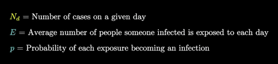 하루에 늘어난 감염자 수는 다음 식으로 표시됩니다. 'd'는 일자를 나타내는 변수입니다. 위의 식을 다음과 같이 표현하면 Nd는 특정일의 감염자 수, Nd+1은 1일 이후 감염자 수가 됩니다(1+E * p)는 감염자 수의 증가로 나타낼 수 있습니다. N은 하루만의 감염자 수 이므로, 감염자 수가 증가할수록 감염이 빠르게 확대될 수 있습니다.
