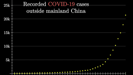 중국 후베이성 무한시에서 발견된 신종 코로나 바이러스 감염(COVID-19)은 2020년 1월 하순부터 전 세계로 유행을 확대하고 있습니다. 중국을 제외한 감염자 수를 정리한 그래프를 YouTube 수학 해설 채널인 3Blue1Brown에서 공개하고 있으며, 약 1개월 반 만에 기하급수적으로 확대되고 있음을 알 수 있습니다.