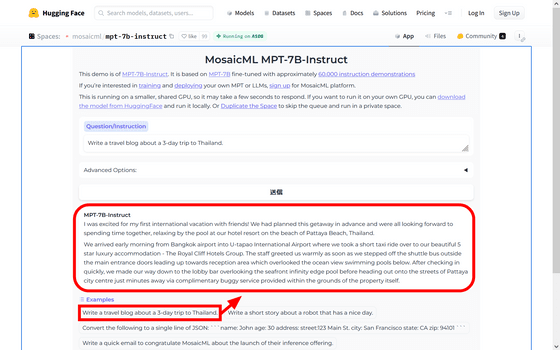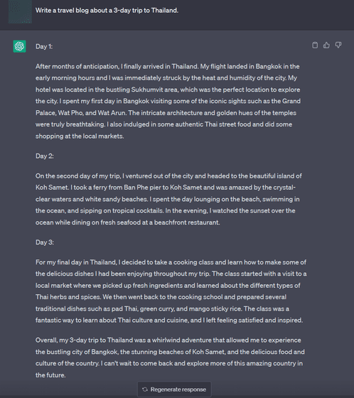 데모 페이지에 기재되어 있던 질문 예제의 프롬프트를 그대로 복사하여 입력해 봤습니다. 그러자 약 900자로 「3일간의 태국 여행 블로그」를 출력했습니다.