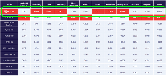 MPT-7B는 Meta의 대규모 언어 모델 "LLaMA"의 파라미터 수 70억 모델 "LLaMA-7B"와 동등한 품질을 확보하고 있으며, 표준적인 태스크에서는 7B~20B의 언어 모델을 능가하는 성능을 보여줍니다.