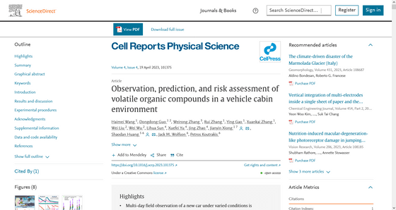 실험에는 제조로부터 1개월 이내의 새 차인 플러그인 하이브리드 중형 SUV 차량이 사용되었습니다. 연구팀은 이 차량을 12일 동안 실외에 놓고 햇빛에 노출시킨 후, 차내의 공기 샘플을 가스 크로마토그래피 질량분석법으로 분석했습니다. 화학물질의 건강 리스크를 평가하는 데 있어서는, 하루에 11시간 차를 운전하는 택시 드라이버와, 하루에 1시간 30분 차를 타는 승객을 상정해, 측정된 화학물질을 경피 섭취 혹은 흡인했을 때의 영향이 조사되었습니다. VOS에 의한 영향의 대부분은 호흡에 의한 것이었다고 합니다.
