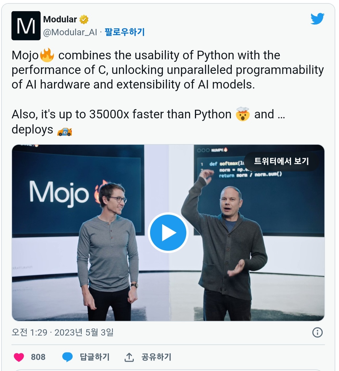 Modular는 2023년 5월 3일에 개최한 제품 발표 이벤트에서 기존보다 빠르고 확장성이 좋은 프로그래밍 언어 'Mojo'를 발표했습니다.