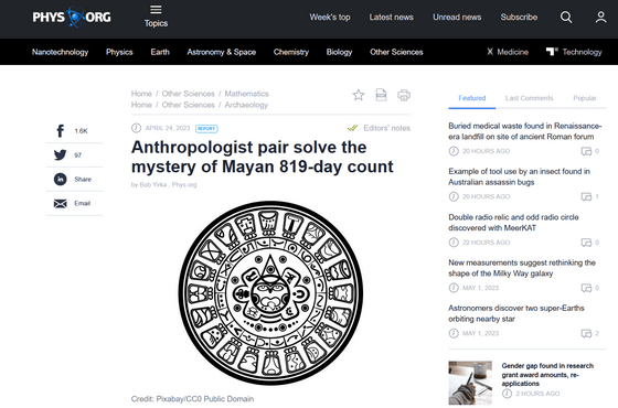 고대 마야 문명의 유적에서 발굴되는 비문 중에는 819일 주기가 있으며, '도대체 왜 819인가'라는 수수께끼는 지금까지 많은 학자들을 괴롭혀 왔습니다. 일설에는, 고대 마야인에게 있어서 거룩한 숫자였던 「7」,「9」,「13」을 곱한 것이라고도 알려져 왔습니다만, 새로운 연구에 의해 819일은 '지구에서 보이는 행성의 주기와 관련된 것이었다'라는 것이 드러났습니다.