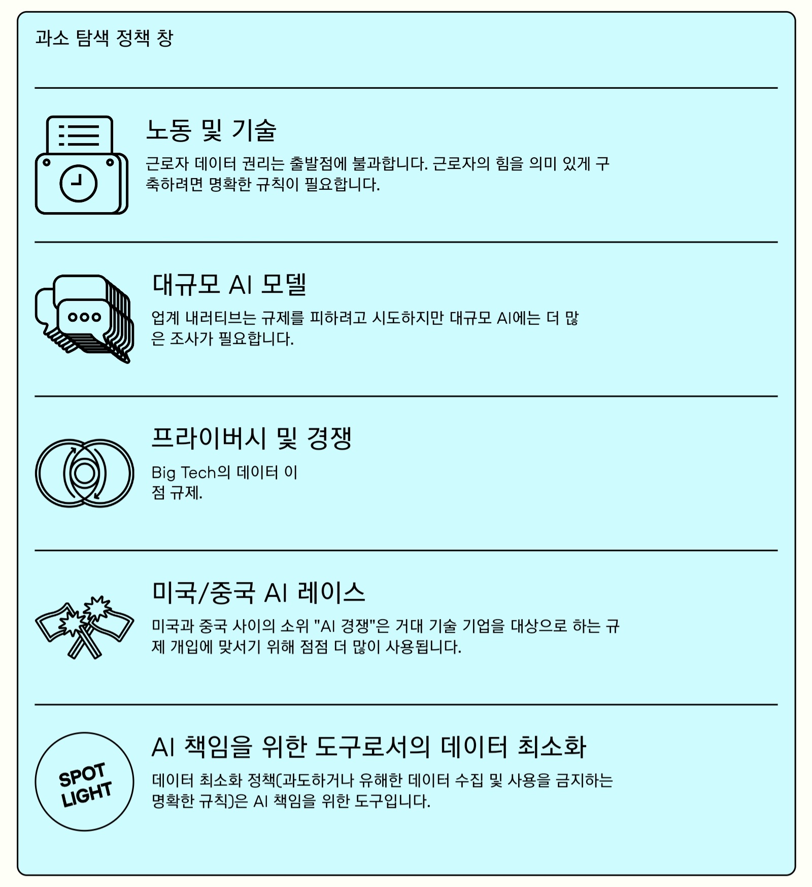 AI Now는 빅테크 기업 우위의 추가 정착을 막기 위해 몇 가지 정책 제언을 하고 있습니다. 그중 하나가 필요한 데이터만을 수집하고 그 이상은 수집하지 않는 '데이터 최소화'라는 개념입니다. 웨스트 박사는 "독점금지법이 개선되어, 이 경쟁에 데이터 프라이버시를 포함시켜 고려한다면 빅테크 기업이 거대화하는 것을 제한할 가능성도 있습니다. 그러기 위해 필요한 것은 보다 강력한 경쟁 규제의 집행입니다. 최근 규제 당국이 주목하고 있다는 굿 뉴스도 있습니다."라고 코멘트하고 있습니다.