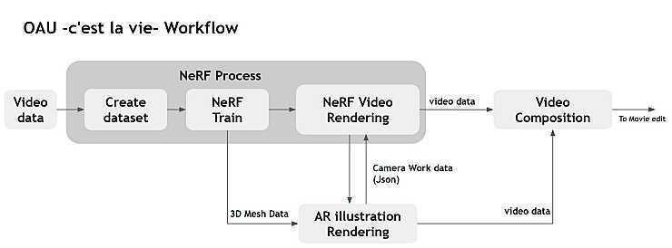 촬영에서 NeRF 영상 생성, 일러스트 합성, 컴포지션까지의 독자적인 워크플로우 구축을 실시하고, NeRF의 프로세스로 생성되는 데이터를 바탕으로 복수의 툴을 연계시키는 형태를 취하고 있습니다.
