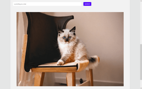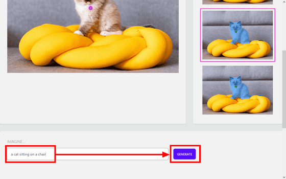 아래로 스크롤하여 프롬프트 입력란에 적절한 프롬프트를 입력합니다. 이번에는 쿠션 대신 의자에 앉아있는 고양이의 이미지로 바꾸기 위해, "a cat sitting on a chair"를 입력했습니다. 입력을 마쳤으면 'GENERATE'를 클릭합니다.