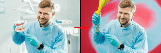 이번에는 치아 모형과 칫솔을 가진 치과 의사의 사진을 "a person holding a maracas in his hand"이라는 프롬프트로 편집(마라카스는 흔들어 소리를 내는 악기입니다).