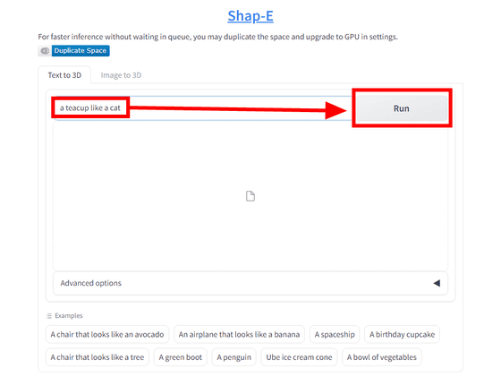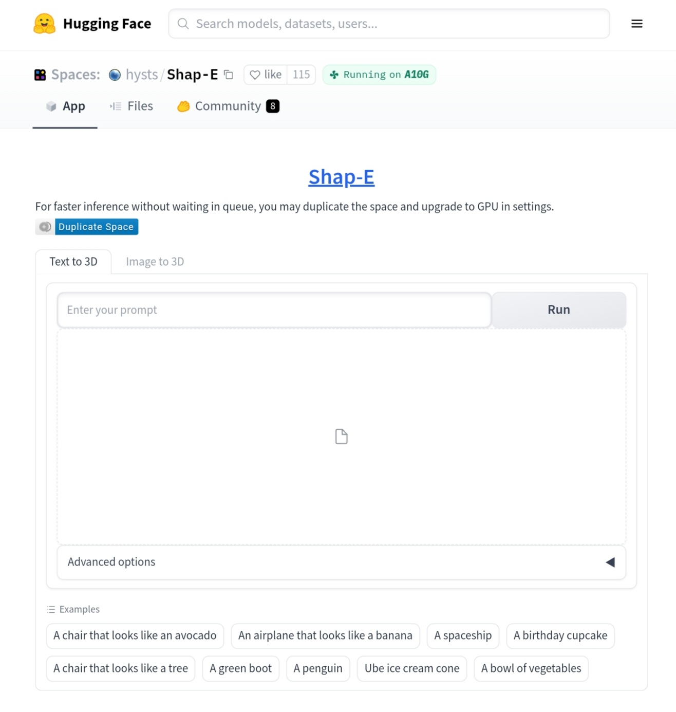 기계 학습 엔지니어 hysts 씨가 Shap-E를 체험할 수 있는 데모 사이트를 AI용 리포지토리 사이트 Hugging Face에 공개하고 있어, Shap-E가 어떤 AI인지를 브라우저에서 쉽게 체험해 볼 수 있습니다.