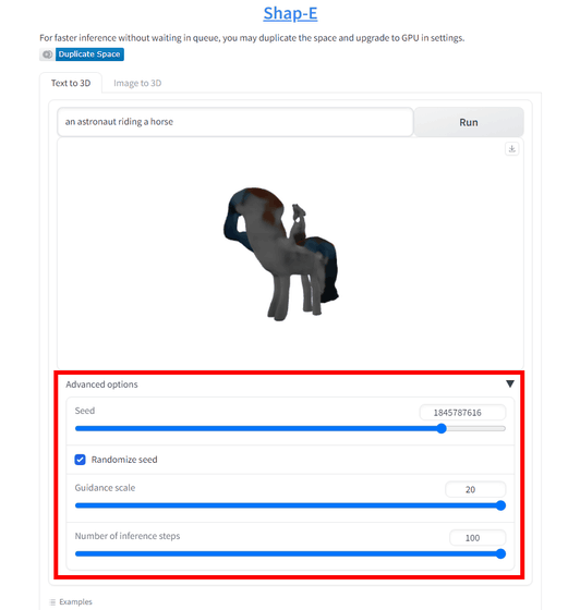 3D 모델이 표시되는 공간 아래에 있는 [Advance options]를 클릭하여 Seed(시드값) · Guidance scale · Number of inference steps(스텝 수)를 변경할 수 있습니다. 가이던스 스케일을 20, 스텝수를 100으로 설정해, 「an astronaut riding a horse(말을 타고 있는 우주 비행사)」를 생성해 본 것이 아래.