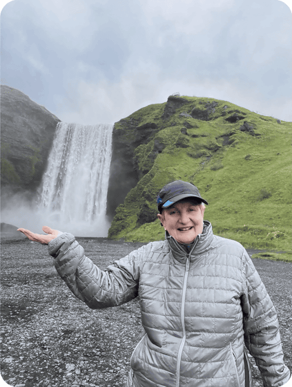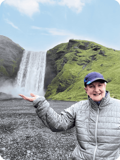베이스가 되는 사진은 폭포를 배경으로 여성이 서 있습니다.