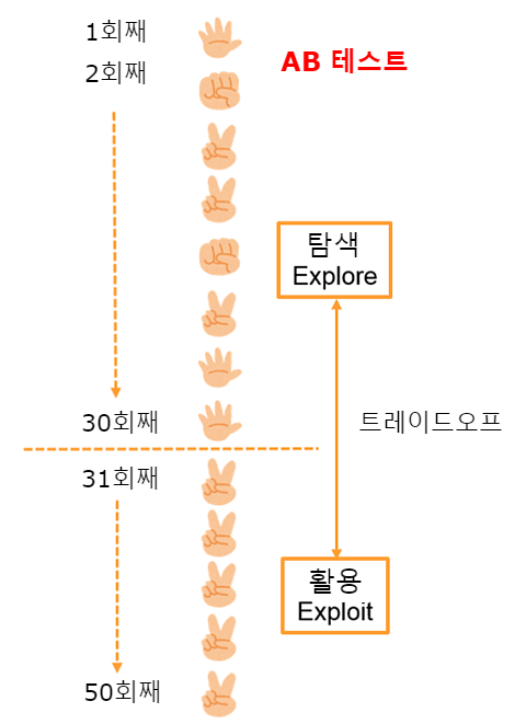 영희와의 가위 바위 보 승부에 AB테스트를 사용해 봅시다. 처음에 10회씩 가위 바위 보를 고르게 내고 영희의 버릇을 탐구하여 '보'를 많이 낸다고 판단하여 나머지 20회는 가위를 계속 냅니다.