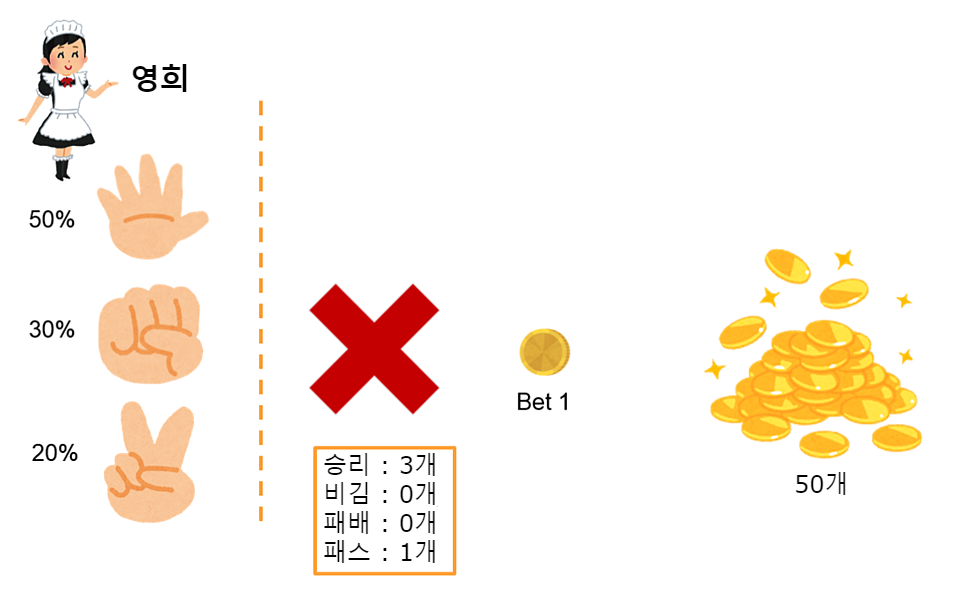 사람에게는 각각의 버릇이 있고, 영희는 보를 낼 확률이 50%, 바위 30%, 가위 20%입니다. 만약 그것을 알았다면 처음부터 가위를 계속 내겠죠, 그때의 기대 값은 50회 × 0.5 × 3개 = 75개가 됩니다. 그리고 전부 패스한다면 50장입니다.