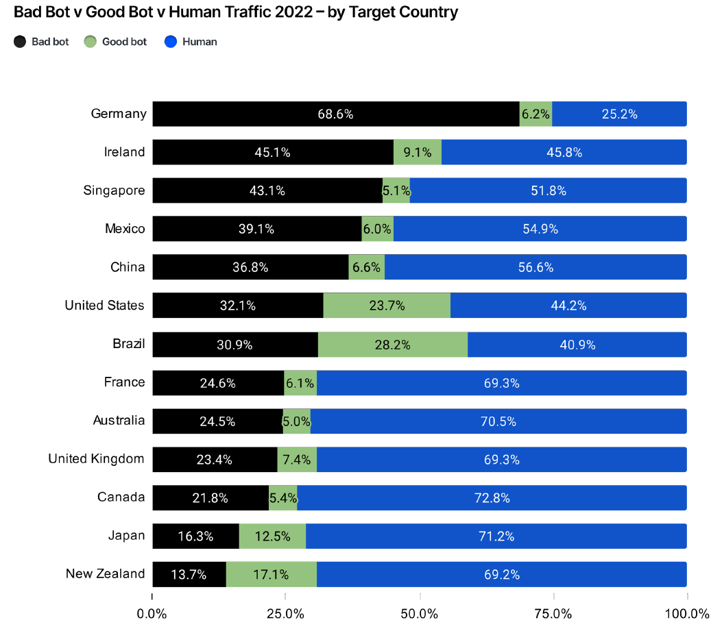 아래는 국가별 비율을 정리한 그림입니다. 독일(Germany)에서는 악질 봇에 의한 통신 비율이 과반수를 넘는 68.6%에 달하고 있습니다.