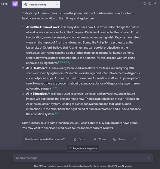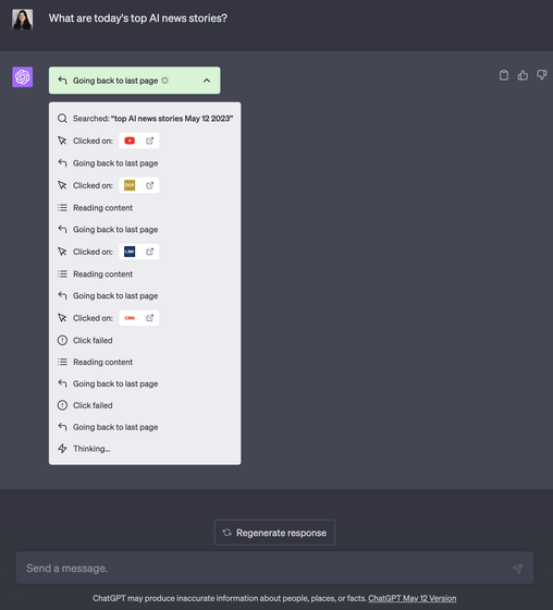웹 브라우징 기능을 활성화하지 않은 경우, ChatGPT에 "What are today's top AI news stories?(오늘의 AI 탑 뉴스는 무엇?)"라고 질문을 해도, 'YouTube 및 기타 뉴스 사이트에 대한 인용 링크'만 표시되어 채팅 화면에서 바로 뉴스를 볼 수는 없습니다.