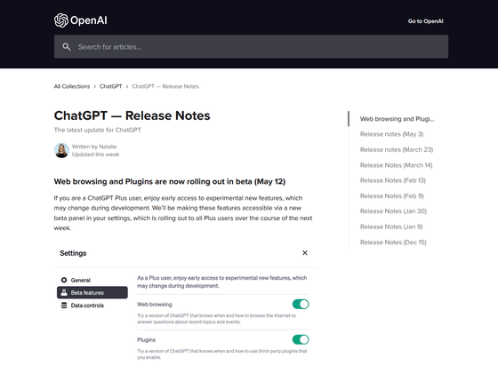 그 후, OpenAI는 현지 시간 2023년 5월 12일에 「모든 ChatGPT Plus 유저에게 웹 브라우징과 플러그인을 전개합니다」라고 발표, ChatGPT Plus의 계약자를 위해 새로운 기능을 테스트하는 '베타 페이즈'로 전환할 것을 밝혔습니다.