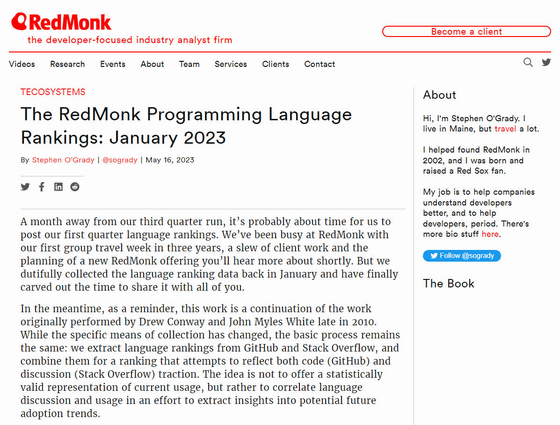 소프트웨어 개발자에 초점을 맞춘 분석기업인 RedMonk가 개발자에게 인기 있는 프로그래밍 언어를 순위화 한 「프로그래밍 언어 랭킹: 2023년 1월 판」을 발표했습니다. 프로그래밍 언어 랭킹은 각 프로그래밍 언어가 GitHub에서 얼마나 활용되는지와 Stack Overflow에서 얼마나 언급되었는지에 따라 계산됩니다.