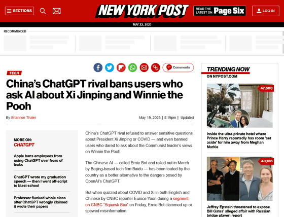 인터넷상에서 「닮았다」고 화제가 된 중국의 국가 주석 시진핑과 「곰돌이 푸」에 대하여, 중국제 채팅 AI인 「Ernie」에서는 비교가 금지되고 있어, 실제로 시도하면 BAN 되는 것으로 확인되었습니다.