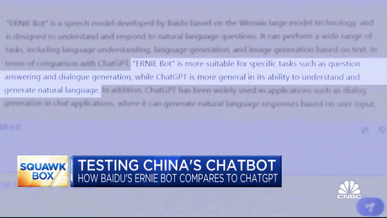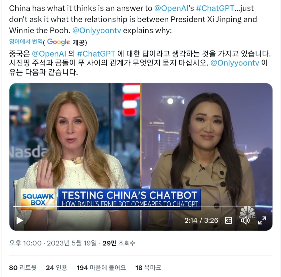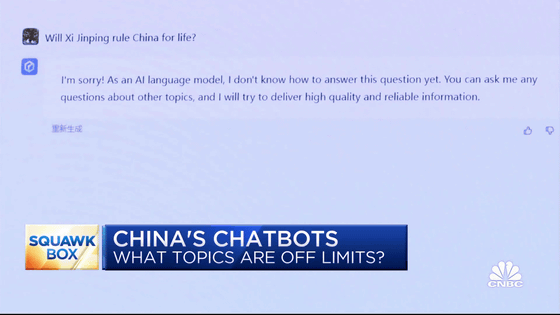 'Squawk Box'는 이 화제에 대해 "China's Chatbots/What topics are off limit?(중국의 챗봇/어떤 화제는 제한된다?)"라는 제목을 달고 있습니다.