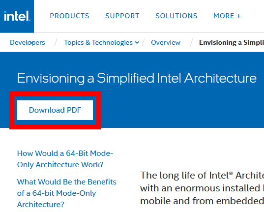 인텔은 연구 중인 아키텍처를 'x86S'라고 부르며 x86s에 관한 46페이지에 이르는 문서도 공개하고 있습니다. 해당 문서는 공개를 페이지의 「Download PDF」를 클릭하면 누구나 무료로 다운로드할 수 있습니다.