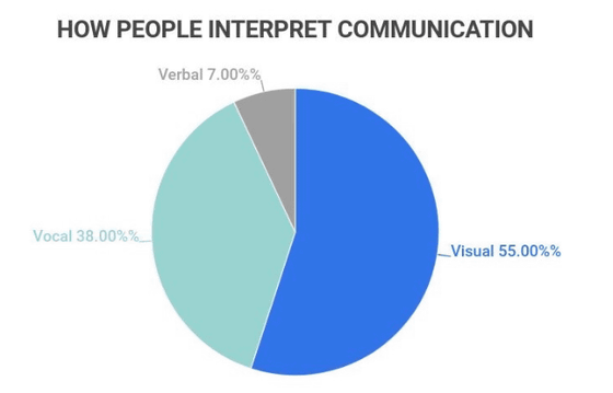 이 밖에 「바디 랭귀지」도 중요합니다. '사람은 어떻게 커뮤니케이션을 해석하는가'라는 조사에 의하면, 대화 내용이 차지하는 것은 7% 뿐이며, 목소리의 상태 등이 38%, 그리고 시각에 의한 부분이 55%를 차지합니다. 이것은 커뮤니케이션의 93%가 비언어 커뮤니케이션에 의해 해석된다고 할 수 있으며, 커뮤니케이션 시의 아이컨택이나 자세, 표정, 손의 움직임 등이 중요하다는 것을 알 수 있습니다.