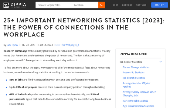 대다수의 구직이 개인 간 및 직업상 생겨난 「인맥」으로 이루어지고 있음에도 불구하고, 이런 인맥이 경시되고 있다고, 구인 · 구직 사이트의 Zippia가 그 실태를 공개했습니다.