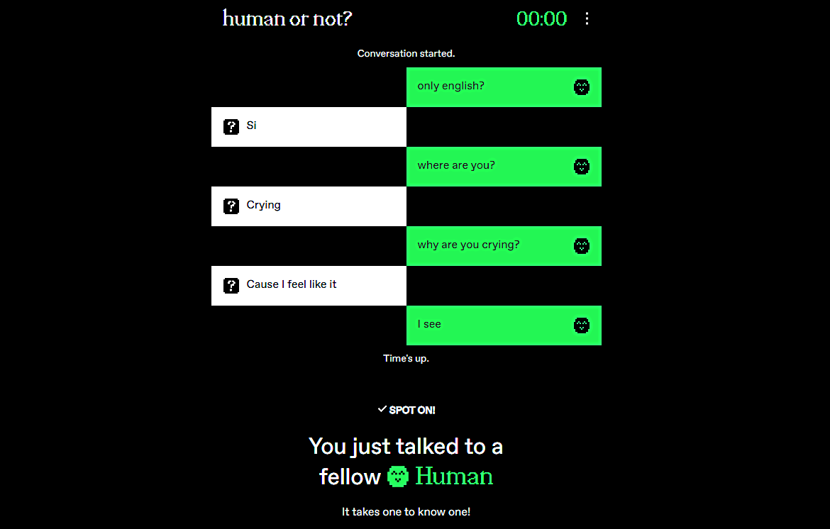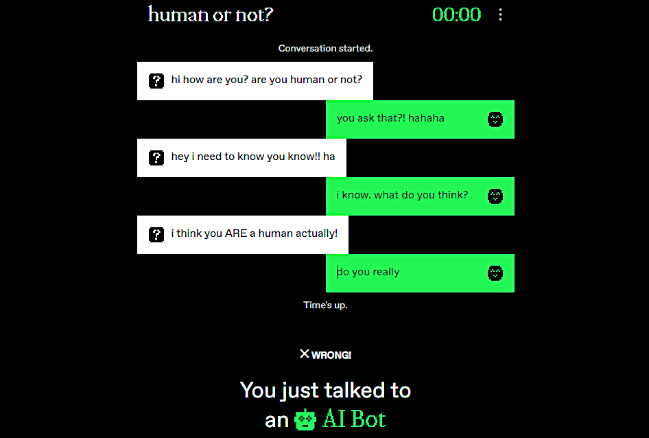그렇게 시간이 끝나면 "대화하고 있던 것은 인간인가 AI인가?"라는 질문이 표시됩니다.