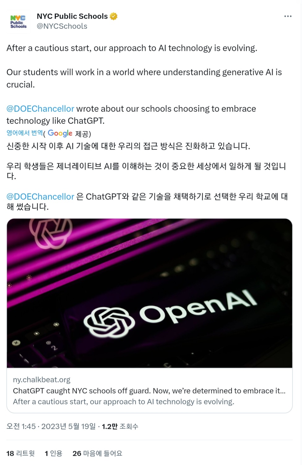 미국 최대의 학구이며 약 110만 명의 학생수를 안고 있는 뉴욕시 교육국(New York City Public Schools)은, 인간과 같은 레벨의 대화가 가능한 대화형 AI ChatGPT의 대두에 즈음하여, 2023년 1월에 "학교에서 ChatGPT 액세스를 금지한다"라고 발표했습니다. 그러나, 2023년 5월, 뉴욕시 교육국의 데이비드 뱅크스 이사장은 이미 당초 방침에서 전환하여 AI를 사용한 교육을 지원하고 있다고 보고했습니다.
