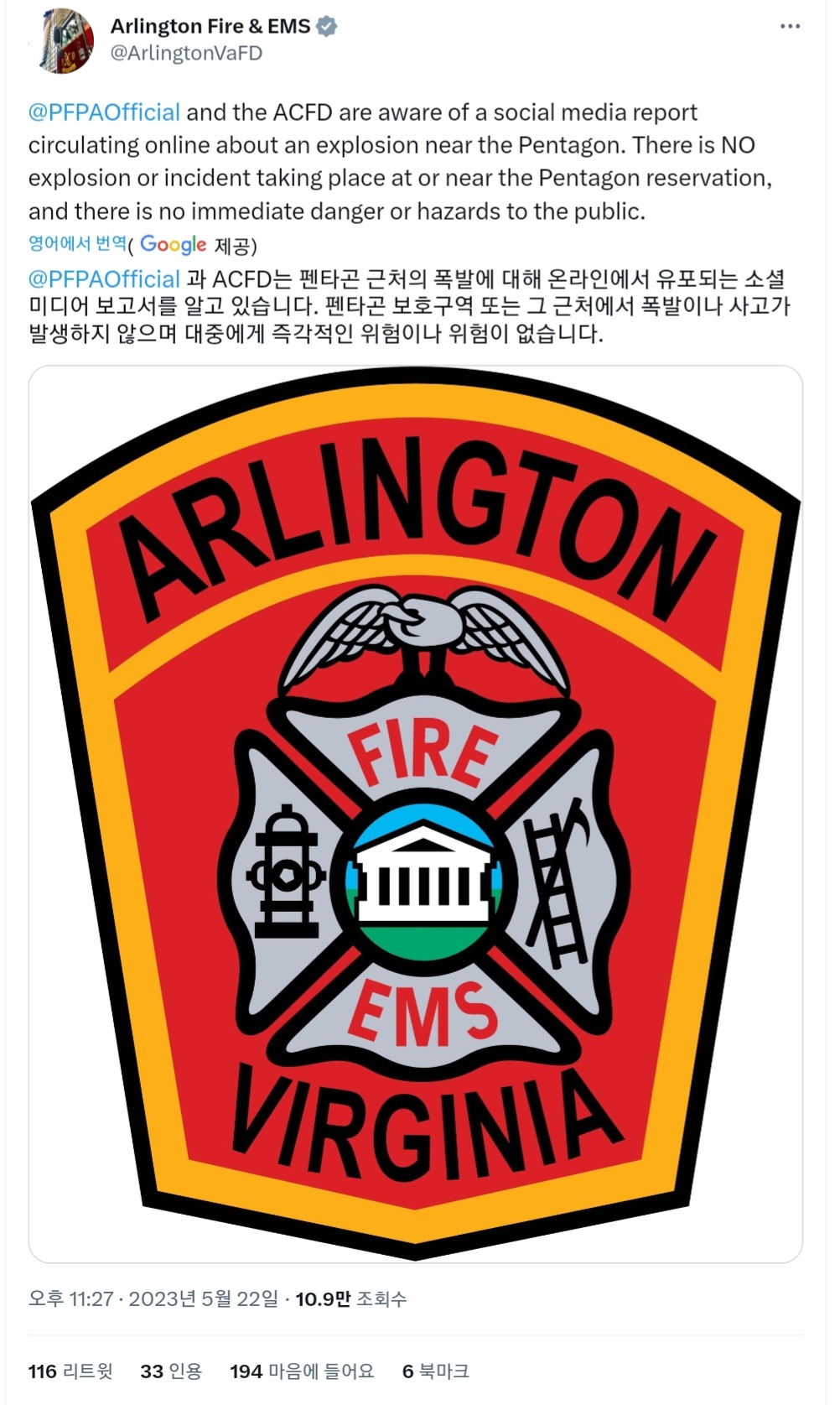 다음날 0시 27분, 펜타곤이 있는 버지니아주 알링턴군을 관할하는 소방서가 "펜타곤 근처에서 폭발이 있었다는 이미지가 인터넷에 나돌고 있다는 것을 인식하고 있습니다. 펜타곤 부근에서는 폭발이나 사건은 일어나지 않았고, 일반 시민에게 직접적인 위험은 없습니다."라고 트윗
