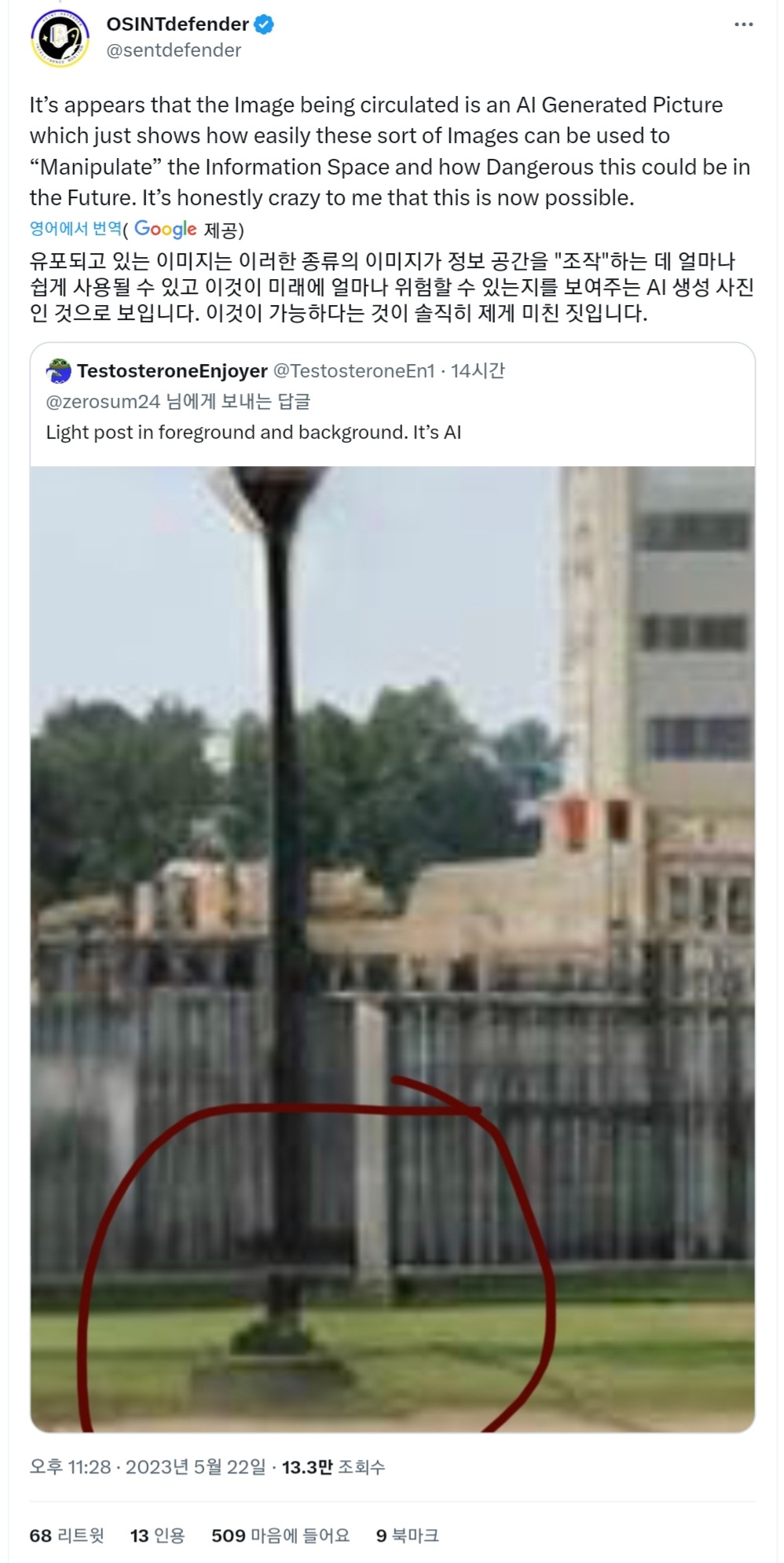 OSINTdefender는 오보를 사과하고, 「가로등의 형태가 이상하기 때문에, 이 이미지는 AI로 생성된 것이다」라고 말하는 한 유저의 트윗을 인용해 「이러한 이미지로 간단하게 정보를 조작할 수 있다. 이러한 일이 가능하다는 것이 솔직히 말해 미친 것 같다」라고 적고 있습니다.