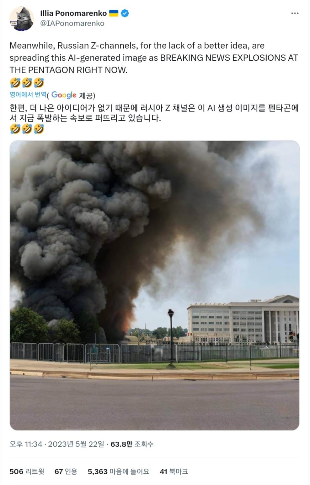 2023년 5월 22일 23시경, 펜타곤 근처에서 폭발이 있었던 것처럼 보이는 가짜 이미지가 Twitter상에서 복수의 어카운트로 확산되어 일부 미디어가 이를 사실이라고 잘못 보도했습니다. 그 결과 주식시장이 일시적으로 하락했습니다.