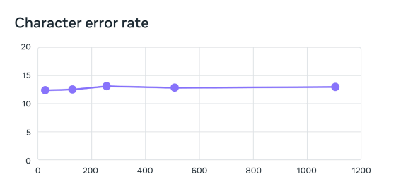 또한 자기 교사 학습을 채택한 Wav2vec 2.0을 사용하여 훈련된 MMS는 언어 수가 61에서 1,107개로 증가해도 오류율이 0.4%밖에 증가하지 않았다고 합니다.