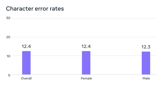 훈련에 사용한 음성 데이터는 남성 화자에 의해 읽히는 것이 많았다고 합니다만, Meta의 분석에 의하면, MMS는 남성 및 여성의 음성에 대해서 거의 동등하게 기능한다고 합니다. 음성인식 에러율을 조사한 아래의 그래프를 보면, 남성(Male)의 에러율은 12.3이고, 여성(Female)의 에러율은 12.4로 되어 있습니다.