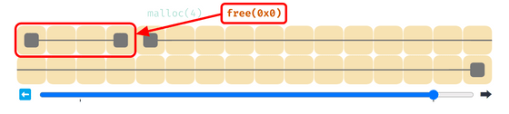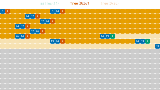 할당 리스트를 보면 몇 바이트의 메모리를 해제하면 되는지 알기 때문에, free를 실행하는 것이 가능하게 되었습니다. 해제된 메모리는 해제 목록에 등록됩니다.