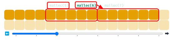 추가로 malloc(5), malloc(6)을 실행하면 대응하는 메모리가 사용 중으로 바뀝니다.