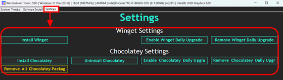 Settings 탭에서는 패키지 관리 시스템의 Winget( Windows Package Manager )나 Chocolatey 를 설치하거나 매일 업데이트하는 설정을 할 수 있게 되었습니다.