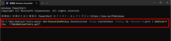 PowerShell이 열리므로 "Set-ExecutionPolicy Unrestricted -Scope CurrentUser -Force; ls -Recurse *.ps*1 | Unblock-File; .\"WinDebloatTools.ps1"" 명령을 입력합니다.