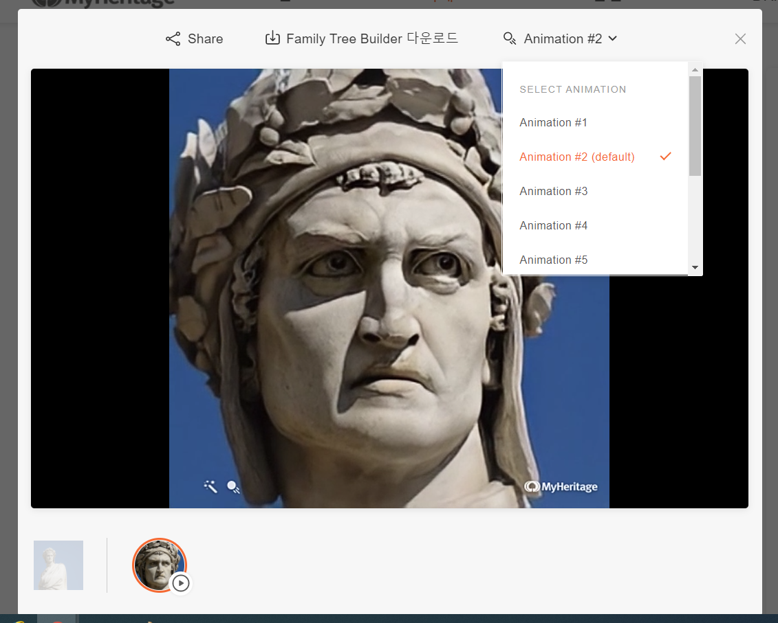 처리가 끝나면 얼굴을 상하 좌우로 움직이는 영상이 흐르기 시작합니다. 눈동자를 움직이며 윙크를 하고, 가끔 입가를 희미하게 움직이는 모습은 마치 살아있는 것 같고, 조금 섬뜩할 정도의 솜씨입니다. "Download video"를 클릭하면 MP4 파일로 다운로드가 가능하지만, 구독 서비스에 가입하지 않으면 동영상의 우측 하단에 MyHeritage 로고 마크가 들어갑니다.